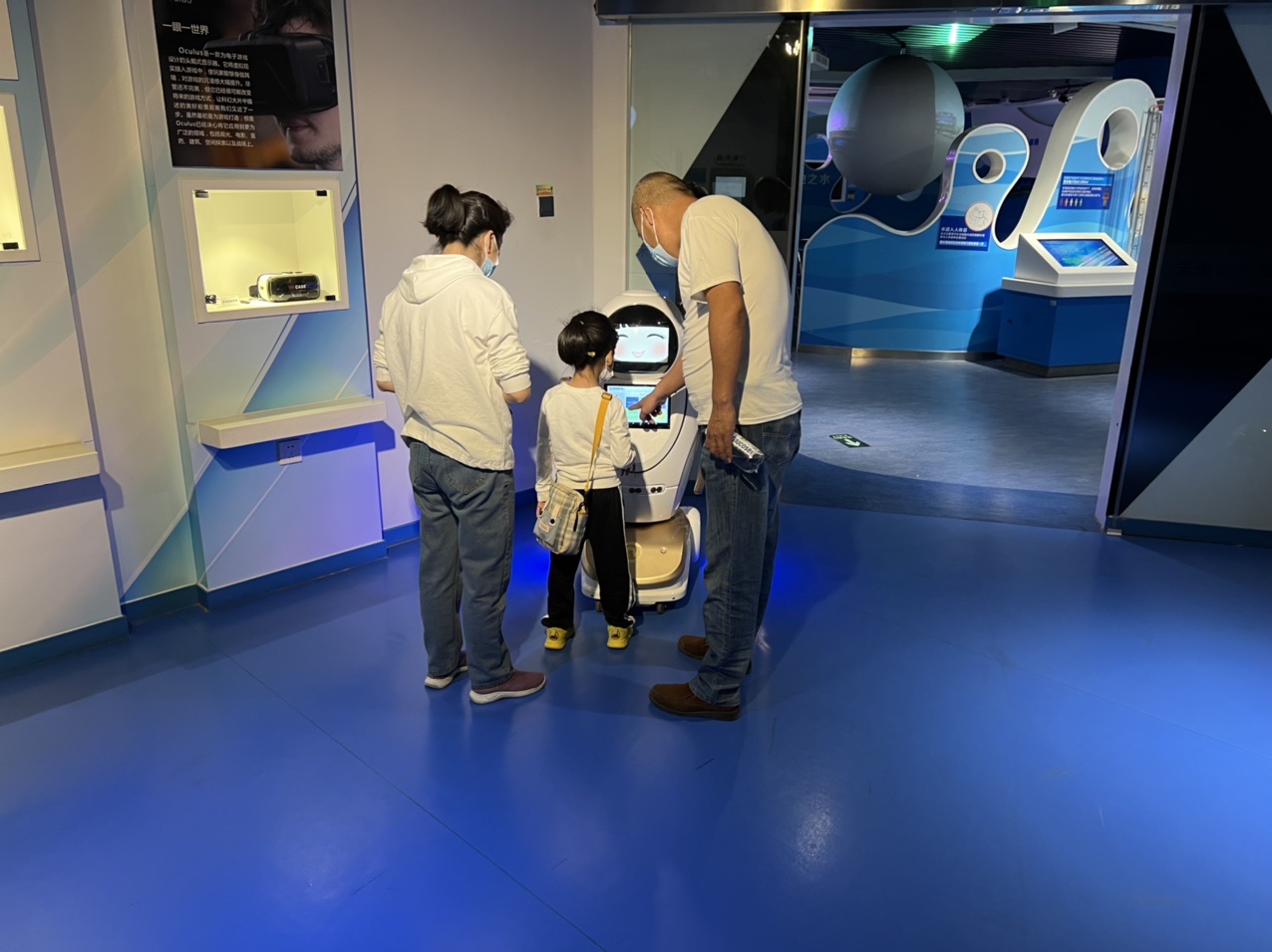 位于展區一層的大屏機器人負責引導觀眾參觀游覽,它可以提供貼心細致的講解和引路服務,智能識別觀眾是否規范佩戴口罩并做好溫馨提示。位于二樓三樓的兩個智能教育機器人,外形乖巧可愛,頭腦機智靈活,一個穿黃衣、一個著紅裙,可以講搞笑段子,會做可愛賣萌的表情,能搖頭晃腦地為大家唱歌,也能與觀眾交流互動、解疑答惑,聰明可愛的模樣非常受小朋友喜愛。