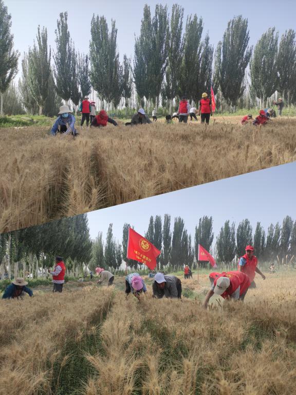 雖然頭頂烈日,塵土飛揚(yáng),汗水也浸透了衣衫,但大家依然干勁十足,沒(méi)有絲毫的倦怠,黨旗也與金色的麥浪交相輝映,呈現(xiàn)出一副豐收繁忙的景象。站立在處處透著麥香的田地間,看著這幅豐收的畫(huà)卷,大家喜笑顏開(kāi),享受到的更是豐收的喜悅和勞動(dòng)的快樂(lè)。