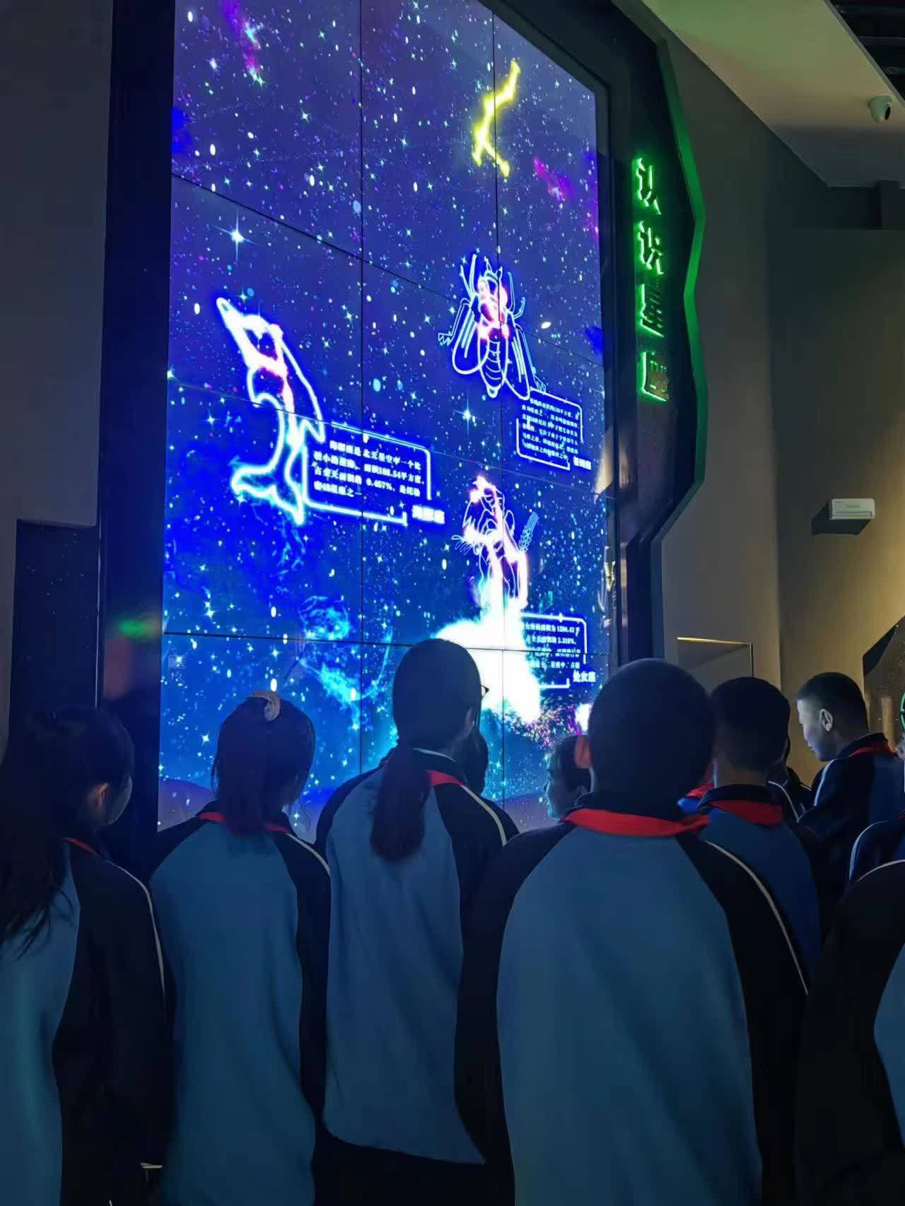 二樓由四個主題展廳組成,分別是恒星廳、銀河系廳、宇宙廳與太空探索廳。內(nèi)有“認識星座”將一顆顆恒星串聯(lián)起來,組成星座將天空劃分區(qū)域,學生們討論著自己的星座并找到了屬于自己的星座圖。主題展廳以隕石為主線串聯(lián)形成一個整體,沿著阿勒泰-近地-地球-太陽系-恒星-銀河系-宇宙這一探索旅程展開,通過探索隕石的不同形態(tài),讓學生們了解到天文各個領(lǐng)域中的知識。