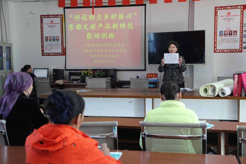 為充分發揮產業扶貧的帶動作用,進一步提高阿勒泰市繡娘的繡技,切實推動阿勒泰市刺繡產業發展,2023年3月24日,由阿勒泰地區科協主辦、阿勒泰市金頂職業培訓學校(阿勒泰達那外貿有限公司)協辦的“科技助力鄉村振興”雪都文旅產品刺繡技能培訓班正式開班,培訓班的第一節課來到了阿勒泰市切木爾切克鎮希巴爾齊村。培訓班特邀阿勒泰市金頂職業培訓學校(阿勒泰達那外貿有限公司)巴格古麗·沃拉勒泰校長進行授課。阿勒泰地區科協三級調研員、地區反邪教協會理事長白金玉,阿勒泰市切木爾切克鎮希巴爾齊村村干部等相關領導親臨培訓現場。該村25名繡娘參加培訓。