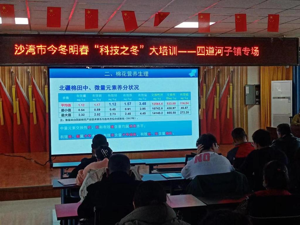 12月5-6日,沙灣市科協(xié)邀請(qǐng)中國農(nóng)業(yè)科學(xué)院棉花研究所副研究員馮路、韓迎春、楊北方,前往四道河子鎮(zhèn)、老沙灣鎮(zhèn)、商戶地鄉(xiāng)開展2023-2024年塔城地區(qū)沙灣市今冬明春“科技之冬”大培訓(xùn),各村干部、農(nóng)村合作社技術(shù)員及農(nóng)戶約500人參加培訓(xùn)。