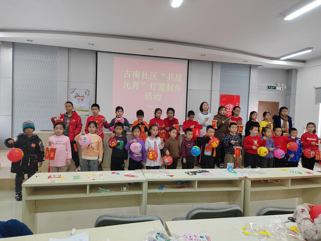 在孩子們歡快的笑聲中,科技志愿者開始分發(fā)材料包,講解燈籠的制作步驟。拿到材料包的孩子們迫不及待地打開材料包跟著家長一起研究起來。在爸爸媽媽的協(xié)助下,孩子們小心翼翼地按照?qǐng)D解說明組裝燈籠,然后給燈籠底部裝上彩燈,頂部裝上燈桿,再掛上流蘇,一個(gè)漂亮的元宵燈籠就誕生了。隨后,孩子們和家長代表一起來到古南社區(qū)廣場,將自己親手制作的元宵燈籠掛在了休憩長廊上,孩子們看著自己親手制作的燈籠成就感滿滿,紛紛與自己制作的燈籠合影留念。