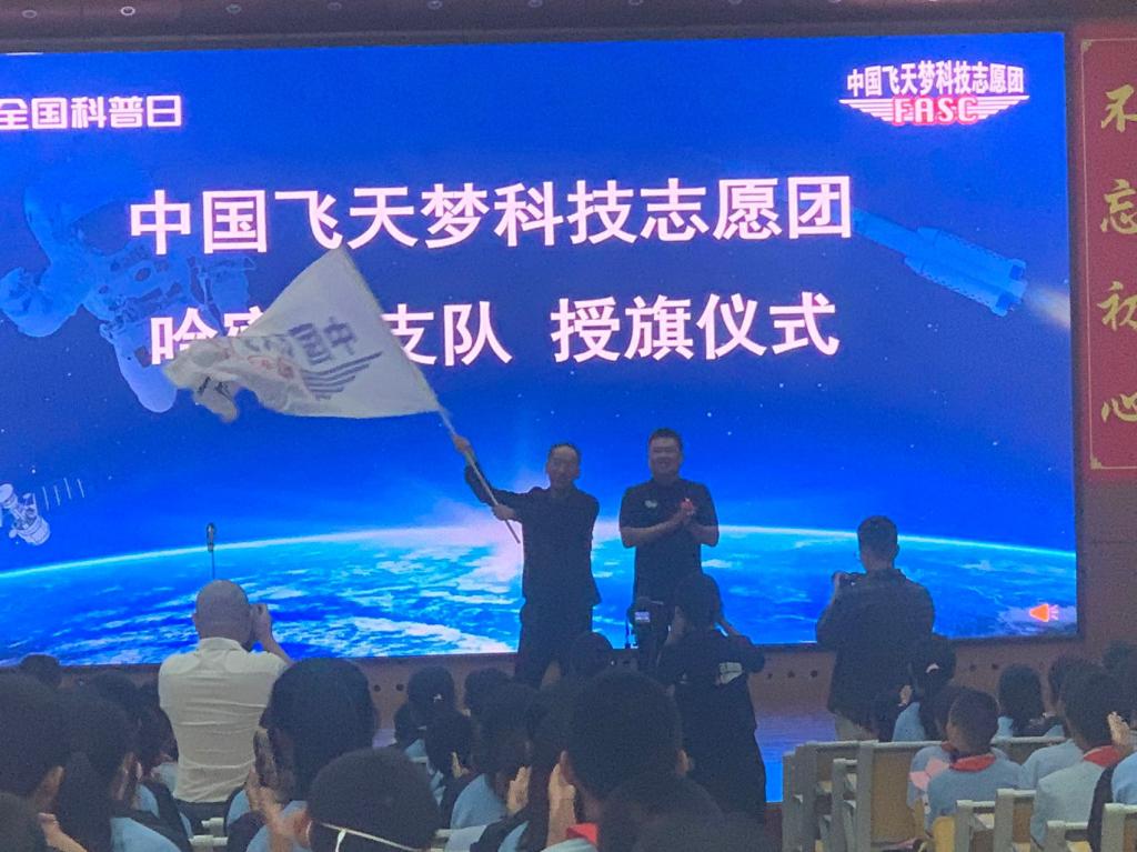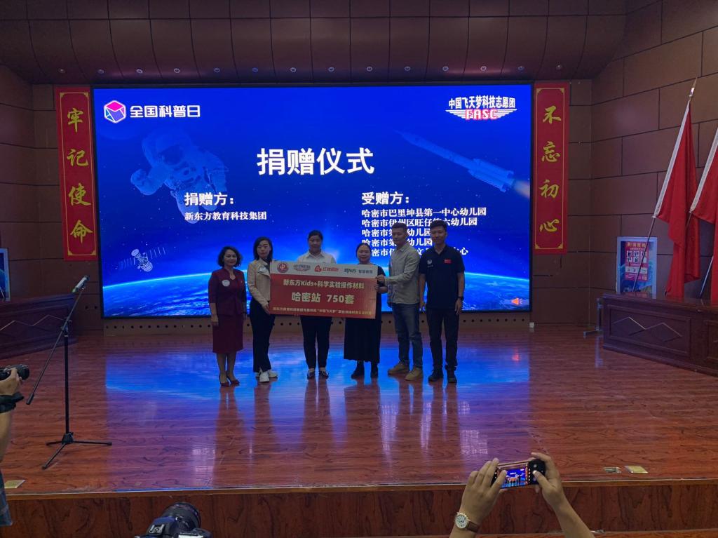 活動中,中國飛天夢科技志愿團為哈密市支隊授旗,中國飛天夢科技志愿團哈密市支隊進行了集體宣誓,中國飛天夢科技志愿團、中國教育發展基金會、新東方科技教育集團為哈密市第七幼兒園、哈密市第八幼兒園、哈密市伊州區旺仔第六幼兒園、哈密市伊州區文朵托管中心、哈密市巴里坤縣第一中心幼兒園等5所幼兒園捐贈750套“新東方Kids+”科學實驗操作材料。