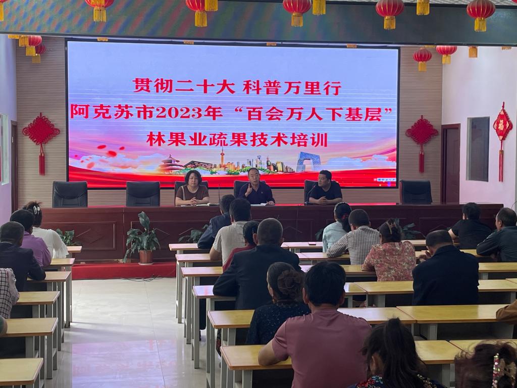 為深入實施全民科學素質行動,持續推進科普啟智惠民,5月24日上午,阿克蘇市科協積極組織科技工作者深入阿克蘇市依干其鎮尤喀克科克巴什村開展阿克蘇市2023年百會萬人下基層林果業疏果技術培訓科普宣傳活動,150余名基層群眾到場參與。