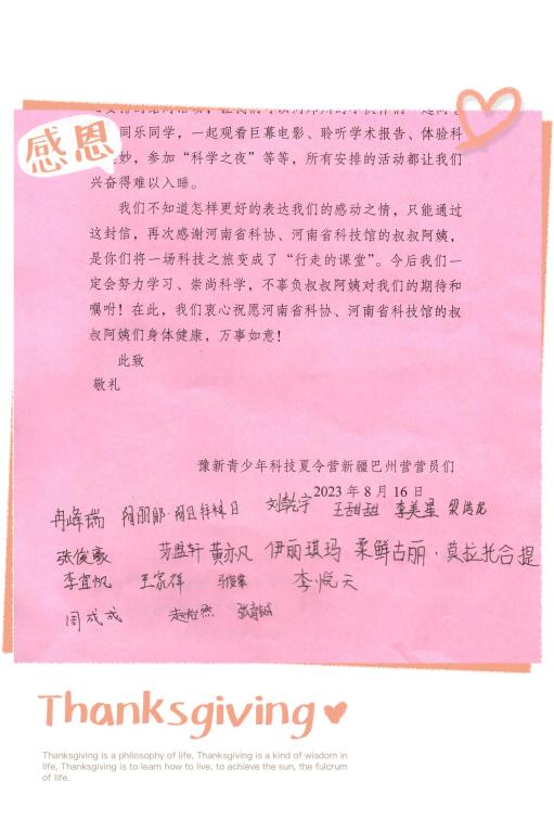 “我們不知道怎樣更好的表達我們的感動之情,只能通過這封信,再次感謝河南省科協、河南省科技館的叔叔阿姨,是你們將一場科技之旅變成了‘行走的課堂’。近日,巴州18名青少年科技夏令營營員向河南省科協、河南省科技館寄出一封誠摯的感謝信。