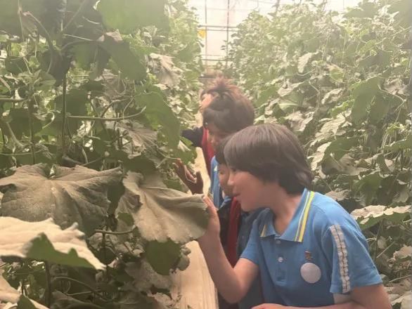 學生們和老科技工作者們共同前往輪臺縣金鑫橋牛羊養殖專業合作社、新疆農業科學院果蔬所輪臺基地(國家新疆特有果樹種質資源圃-輪臺)、巴州永友農業發展有限公司羊角蜜大棚。在養殖合作社和種植基地里,講解員結合實際,向大家詳細講解了現代化養殖技術、特色果樹種質資源保護與培育,以及羊角蜜種植的先進技術。學生們近距離觀察牛羊生長環境、大棚種植模式,直觀感受現代農業科技魅力。老科技工作者們現場示范指導,以多年科研經驗為學生答疑解惑,在動手實踐與提問交流中,拓寬了學生的科學視野,激發了他們對農業科技的濃厚興趣。