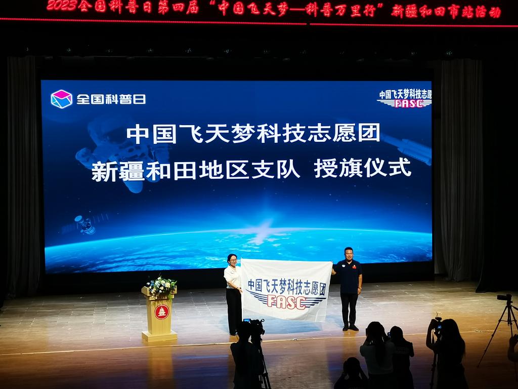 9月14日,2023全國(guó)科普日第四屆“中國(guó)飛天夢(mèng) 科普萬里行”走進(jìn)和田市北京海淀小學(xué),本屆活動(dòng),途經(jīng)全國(guó)6個(gè)省57個(gè)縣市,和田市站是本屆活動(dòng)的第33站。本次活動(dòng)由中國(guó)科協(xié)指導(dǎo),中國(guó)飛天夢(mèng)科技志愿團(tuán)、中國(guó)教育發(fā)展基金會(huì)、北京市飛行者航空科普促進(jìn)中心、北京國(guó)盛航空航天科技發(fā)展研究院共同主辦,新疆科協(xié)、和田市人民政府、和田地區(qū)科學(xué)技術(shù)協(xié)會(huì)、和田市科協(xié)、和田市教育局、和田市北京海淀小學(xué)承辦的2023年全國(guó)科普日啟動(dòng)儀式暨第四屆“中國(guó)飛天夢(mèng)——科普萬里行”新疆和田站活動(dòng)在和田市北京海淀小學(xué)舉行,現(xiàn)場(chǎng)500余名師生參加此次活動(dòng)。活動(dòng)現(xiàn)場(chǎng),中國(guó)飛天夢(mèng)科技志愿團(tuán)團(tuán)長(zhǎng)李俊天同志向和田地區(qū)支隊(duì)授旗,志愿者代表上臺(tái)宣誓,加入中國(guó)飛天夢(mèng)科技志愿團(tuán)。啟動(dòng)儀式上,和田市人民政府副市長(zhǎng)巴圖爾·阿卜杜拉致詞。