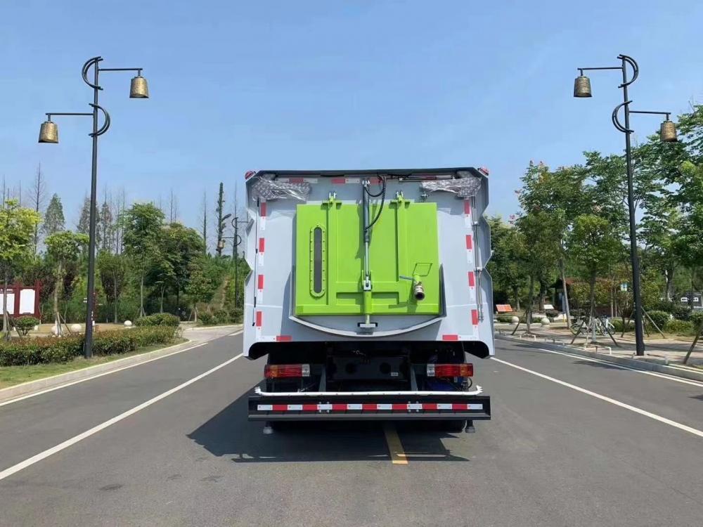 高效洗掃車利用高壓水流及傾斜掃刷將垃圾掃**吸盤前面,在風機產生的負壓作業下,風流在閉合的回路中將垃圾吸入垃圾箱中貯存,整個作業過程均是物理原理,不會產生化學廢料或垃圾外泄對環境的二次污染,同時,后噴霧的降塵有效的降低了空氣中粉塵濃度,解決粉塵污染問題。