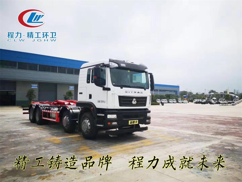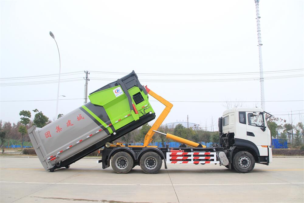 該款鉤臂式垃圾車由液壓系統、操作系統組成。舉升油制缸(1支)系國內知名液壓件廠家生產的雙作用油缸。垃圾廂可自吊上放下,可自行傾倒垃圾,上下一次工作循環時間≤50S。該車的特點是一個車能配多個垃圾廂,能實現一臺車與多個垃圾廂聯合作業,循環運輸,充分提高了車輛的運輸能力。