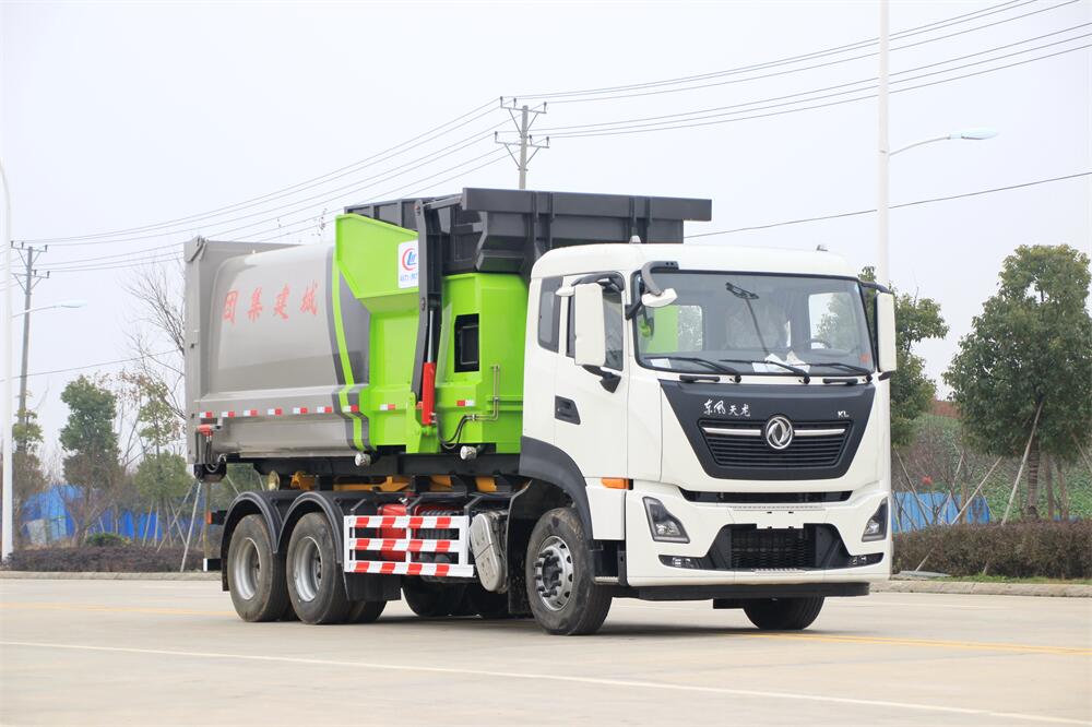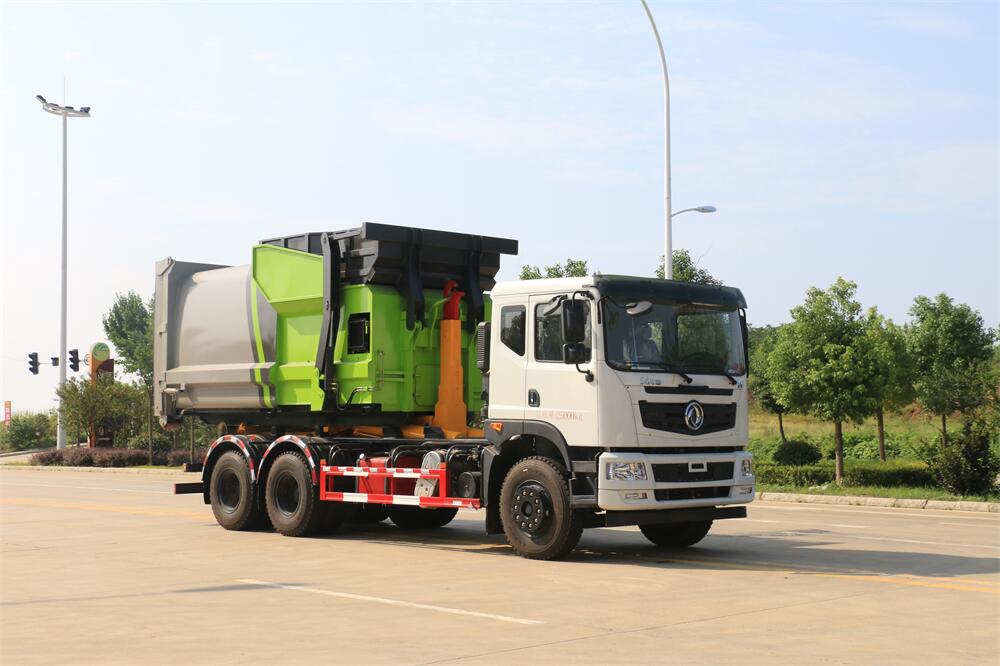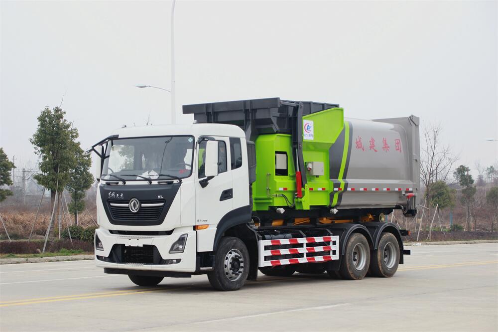 勾臂式垃圾車(車廂可卸式垃圾車)介紹: 車廂可卸式垃圾車又叫拉臂式垃圾車,是一種采用高新設計可伸縮的鉤臂,實現垃圾廂的二次吊裝,自吊上放下,可自行傾倒垃圾的環衛設備。 拉臂式垃圾車結構簡單,操作穩定方便,裝卸效率高,機械化程度高,節省人力。鉤臂垃圾車一車可帶多個垃圾廂,在裝卸的運輸過程中可有效地避免二次污染。 拉臂垃圾車采用高新設計可擺動的鉤臂,垃圾箱由框架、開啟油缸、滑輪、后門和若干加強框架與鋼板焊接而成。調換貨廂快捷方便,貨廂上帶蓋(倒垃圾時可翻開),鉤臂垃圾車垃圾廂體可選用碳鋼、不銹鋼材質、內部采取環氧樹脂防腐處理,改裝部分與原車底盤為可分離式,維修方便且保持了原車的機動性及行駛性能。