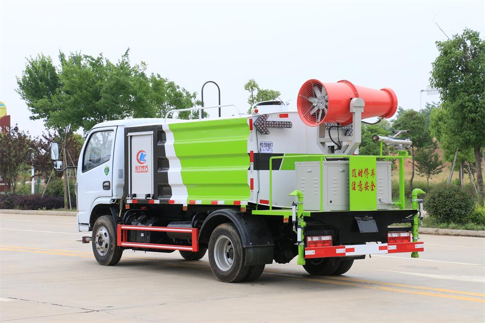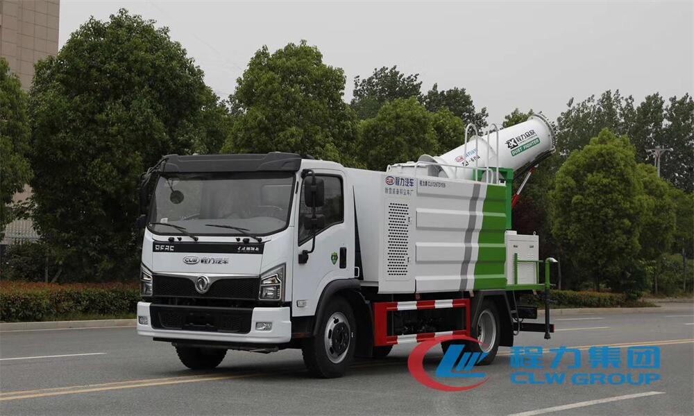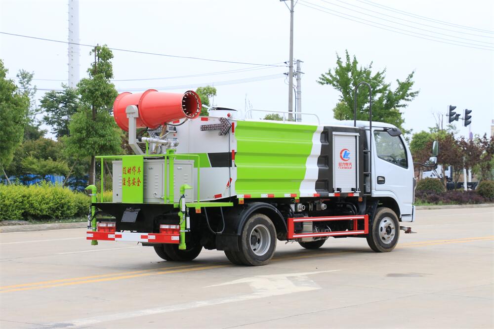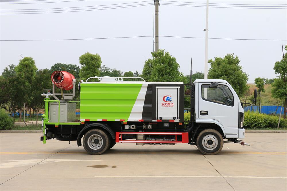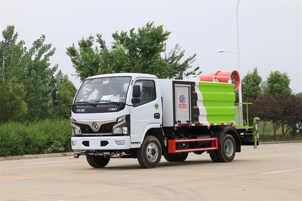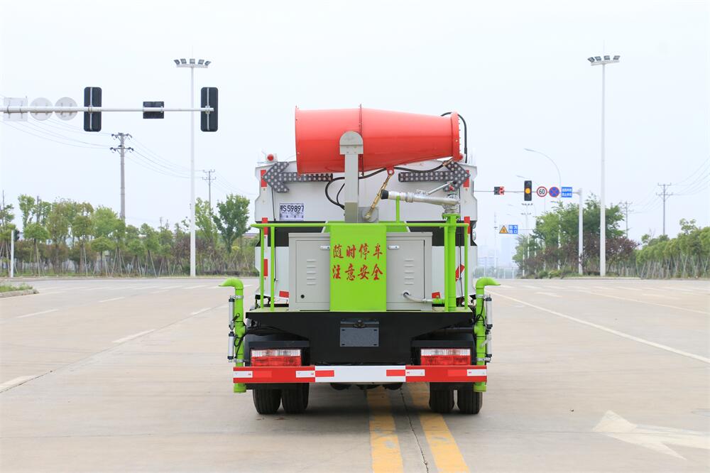 上裝配置:罐體容積為 5-7立方,選配風送式霧炮機組射程30米、40米、50米、60米、80米、100米、120米霧炮,罐體鋼板為4mm碳鋼Q235材質,罐內隔板具有防波作用,以減輕汽車行駛時罐體液體沖擊,罐體及整車外形尺寸按照公告。帶大功率專用灑水泵,泵可自吸自排,整車前沖、后灑、側噴、帶65消防接口,后平臺配CLW-50、CLW-60、CLW-80、CLW-100、CLW-120型風送式霧炮機組;罐體前封頭配大功率柴油發電機組;前封頭帶水位計,后平臺主管路帶1寸澆花接口,后爬梯。帶兩根輸水管及陰陽端。罐體顏色:銀/灰/綠,罐體兩側噴“多功能抑塵車”字樣,貼反光標示。