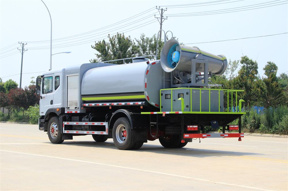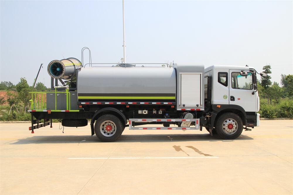 上裝配置:罐體容積為 12立方,選配風送式霧炮機組射程30米、40米、50米、60米、80米、100米、120米霧炮,罐體鋼板為4mm碳鋼Q235材質,罐內隔板具有防波作用,以減輕汽車行駛時罐體液體沖擊,罐體及整車外形尺寸按照公告。帶大功率專用灑水泵,泵可自吸自排,整車前沖、后灑、側噴、帶65消防接口,后平臺配CLW-50、CLW-60、CLW-80、CLW-100、CLW-120型風送式霧炮機組;罐體前封頭配大功率柴油發(fā)電機組;前封頭帶水位計,后平臺主管路帶1寸澆花接口,后爬梯。帶兩根輸水管及陰陽端。罐體顏色:銀/灰/綠,罐體兩側噴“多功能抑塵車”字樣,貼反光標示。