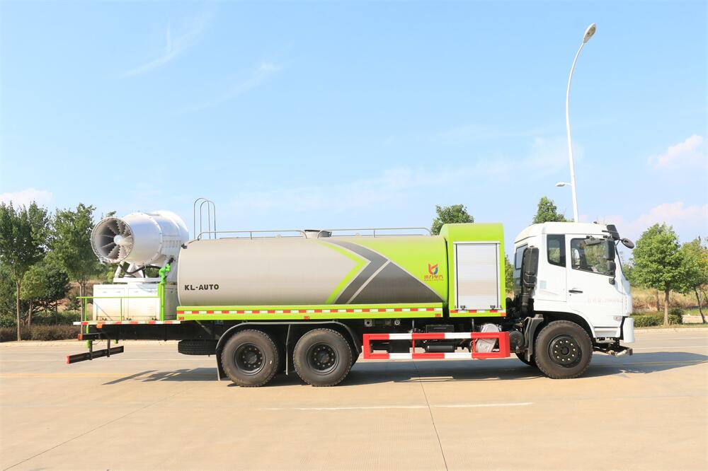 上裝配置:罐體容積為 16立方,選配風送式霧炮機組射程30米、40米、50米、60米、80米、100米、120米霧炮,罐體鋼板為4mm碳鋼Q235材質,罐內隔板具有防波作用,以減輕汽車行駛時罐體液體沖擊,罐體及整車外形尺寸按照公告。帶大功率專用灑水泵,泵可自吸自排,整車前沖、后灑、側噴、帶65消防接口,后平臺配CLW-50、CLW-60、CLW-80、CLW-100、CLW-120型風送式霧炮機組;罐體前封頭配大功率柴油發電機組;前封頭帶水位計,后平臺主管路帶1寸澆花接口,后爬梯。帶兩根輸水管及陰陽端。罐體顏色:銀/灰/綠,罐體兩側噴“多功能抑塵車”字樣,貼反光標示。